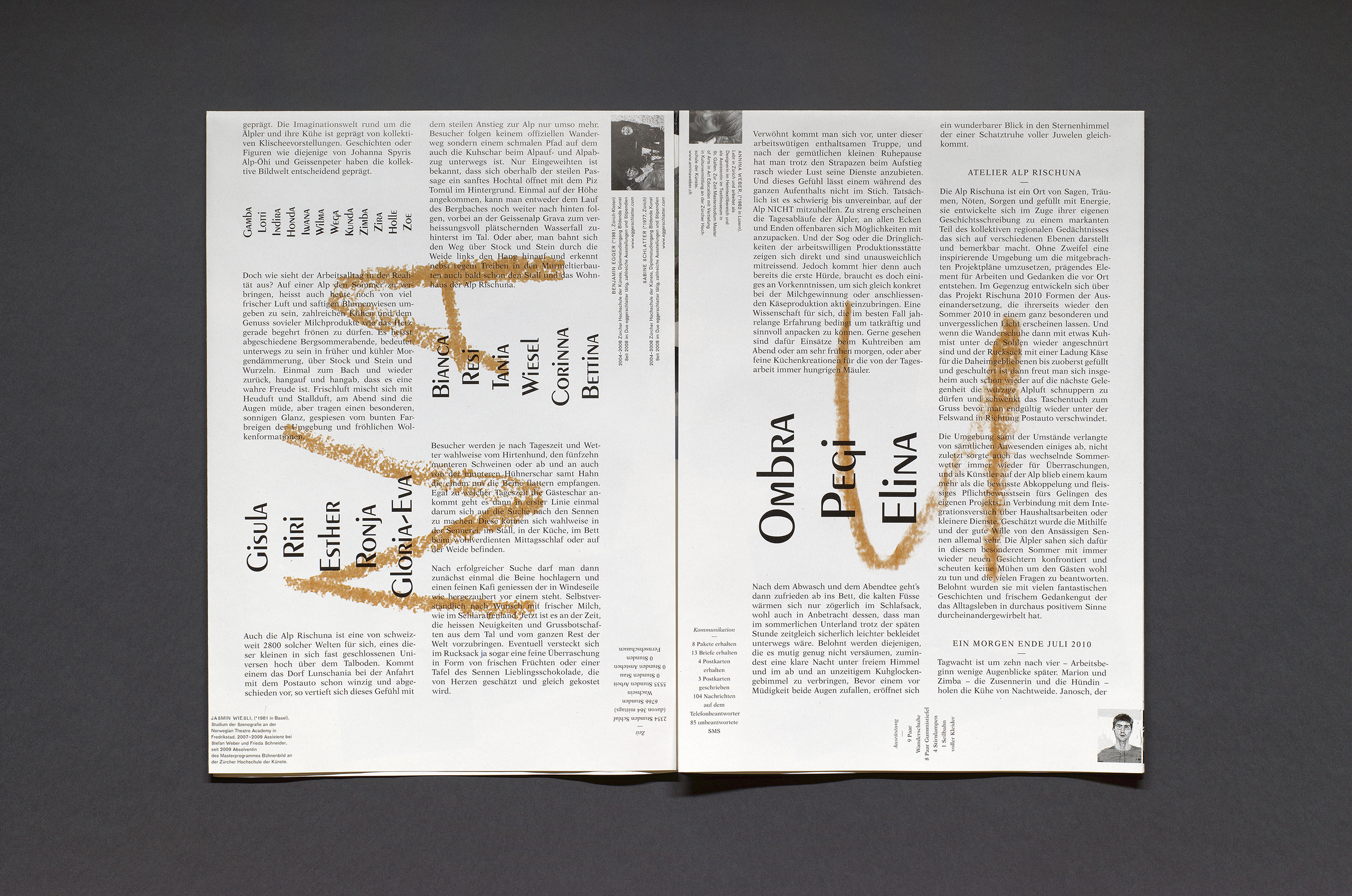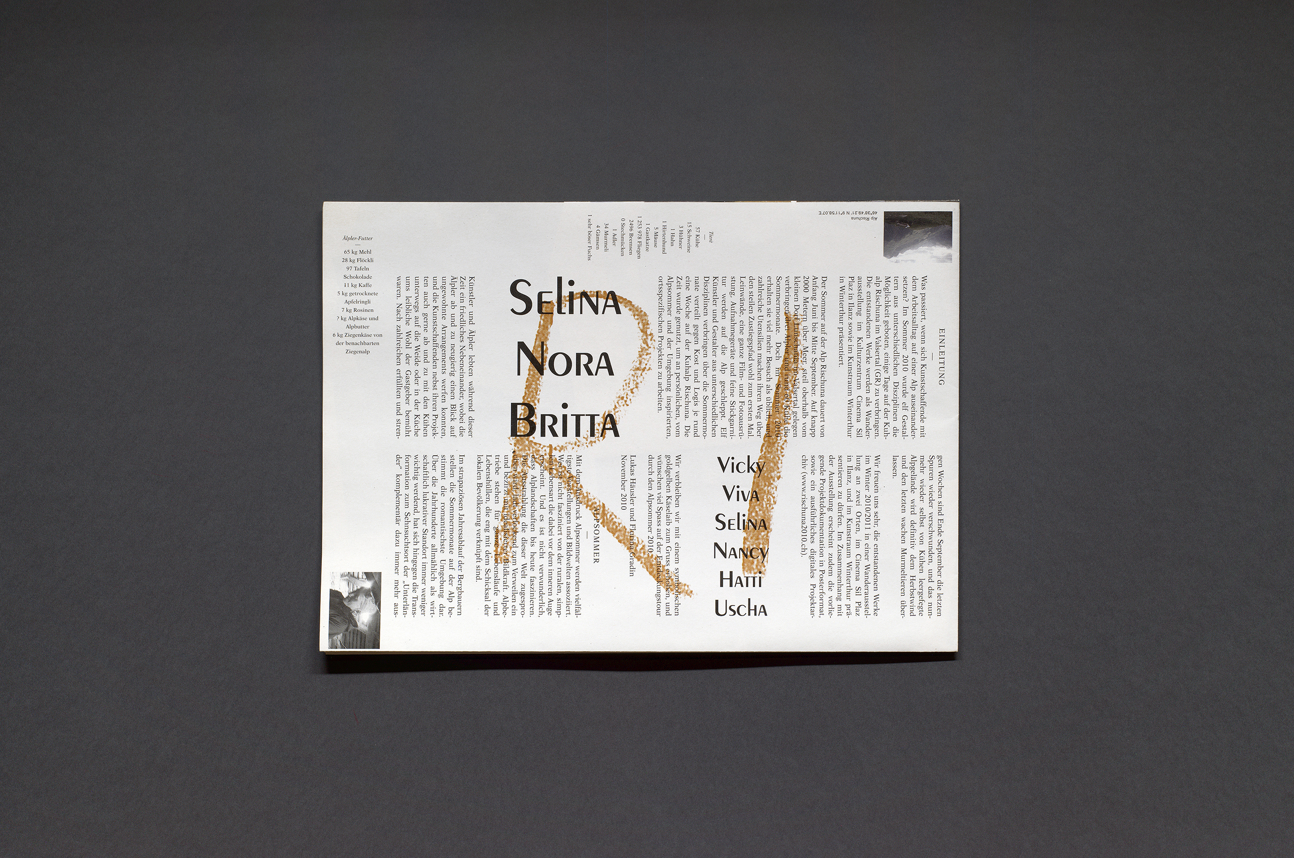 Diese Publikation dokumentiert die Arbeiten der elf Künstlerinnen und Künstler, welche im Jahr 2010 zur Künstlerresidenz „Atelier Alp Rischuna“ im Valsertal eingeladen wurden.